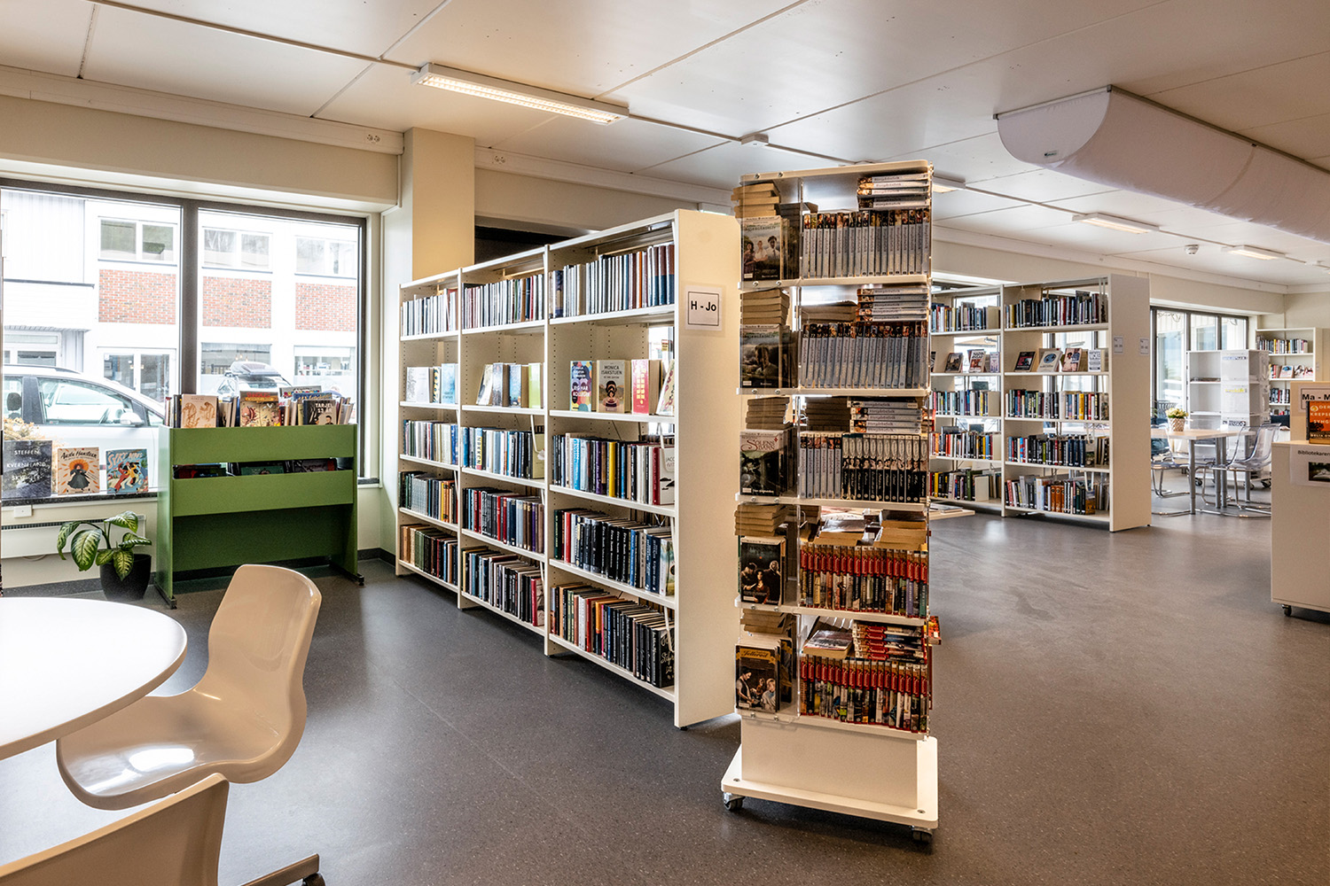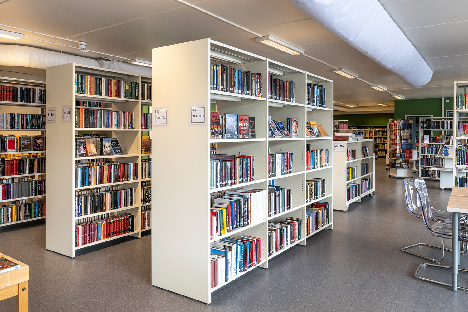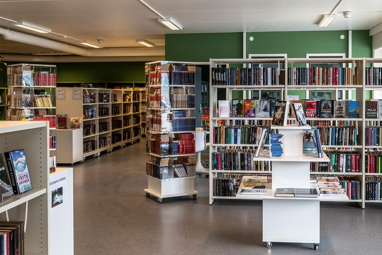 La bibliothèque visait une combinaison harmonieuse de nouvelles étagères fonctionnelles et de comptoirs, agrémentée par la réutilisation de meubles et de présentoirs à livres existants. Notre équipe de design norvégienne, BS Eurobib, a pris en charge l'agencement et les schémas de couleurs, en collaboration avec un distributeur local pour fournir des systèmes d'étagères, des comptoirs, des tours d'exposition, des chariots à livres et bien plus encore.