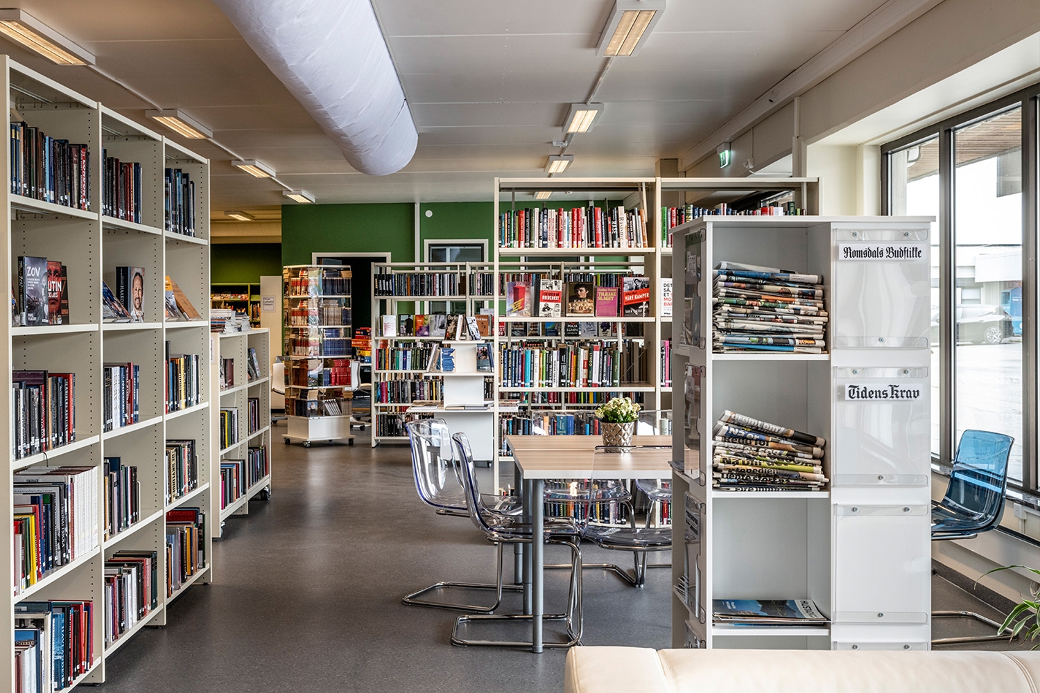 À l’automne 2022, la bibliothèque rénovée de Hustadvika, à Eide, a rouvert ses portes en intégrant de nouvelles étagères et des mobiliers réutilisés. Avec ses grandes fenêtres et son mobilier aux tons clairs, l’espace présente des couleurs vives et une atmosphère ouverte et lumineuse.
