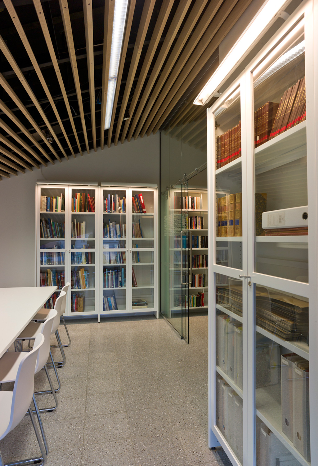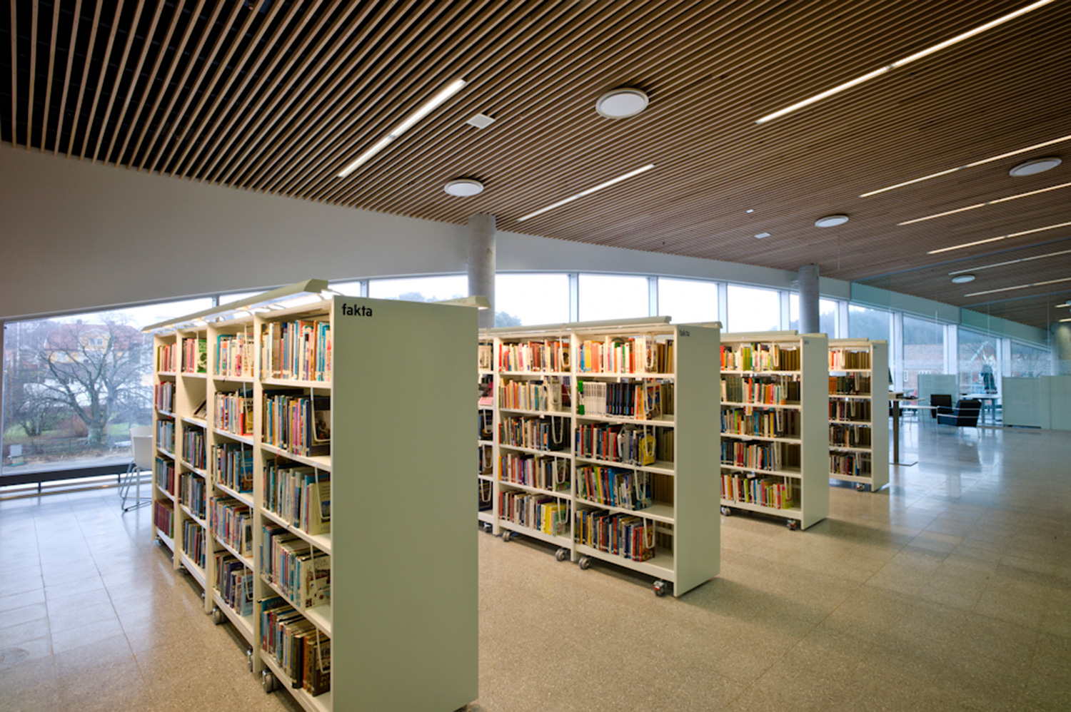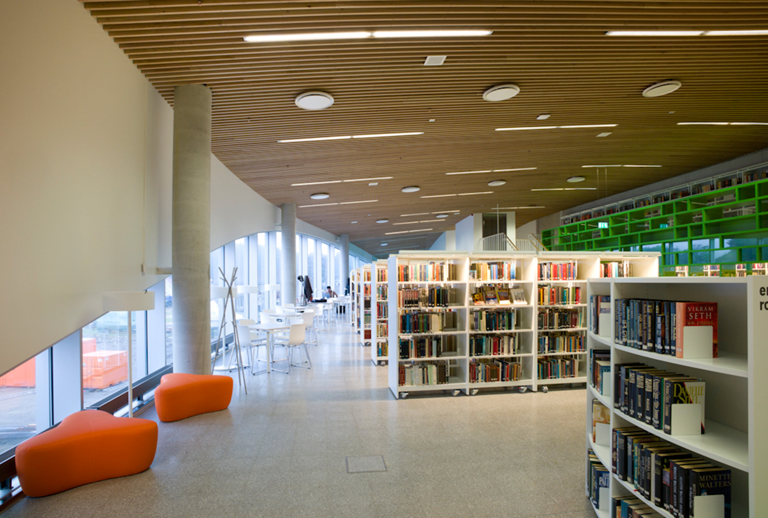 Lumineuse et aérée, la bibliothèque s’étend sur trois étages. L’intérieur se caractérise par un mur vert du plafond au sol spécialement conçu, qui contraste superbement avec les rayonnages blancs. Les vitres panoramiques offrent une vue spectaculaire de le rivière. Nature et tradition rencontrent développement et innovation.