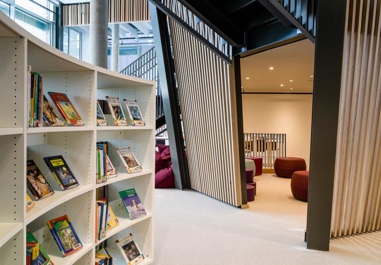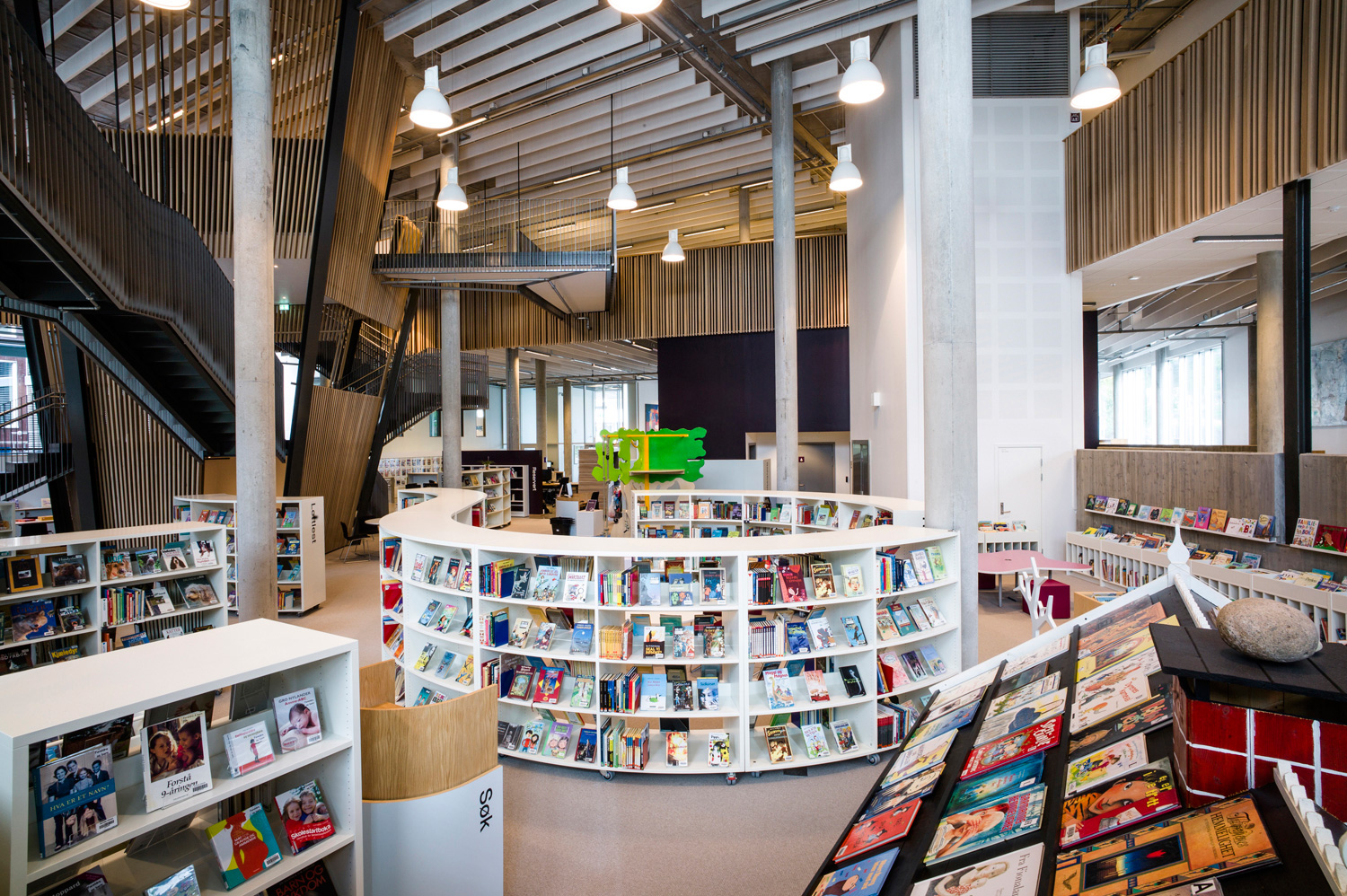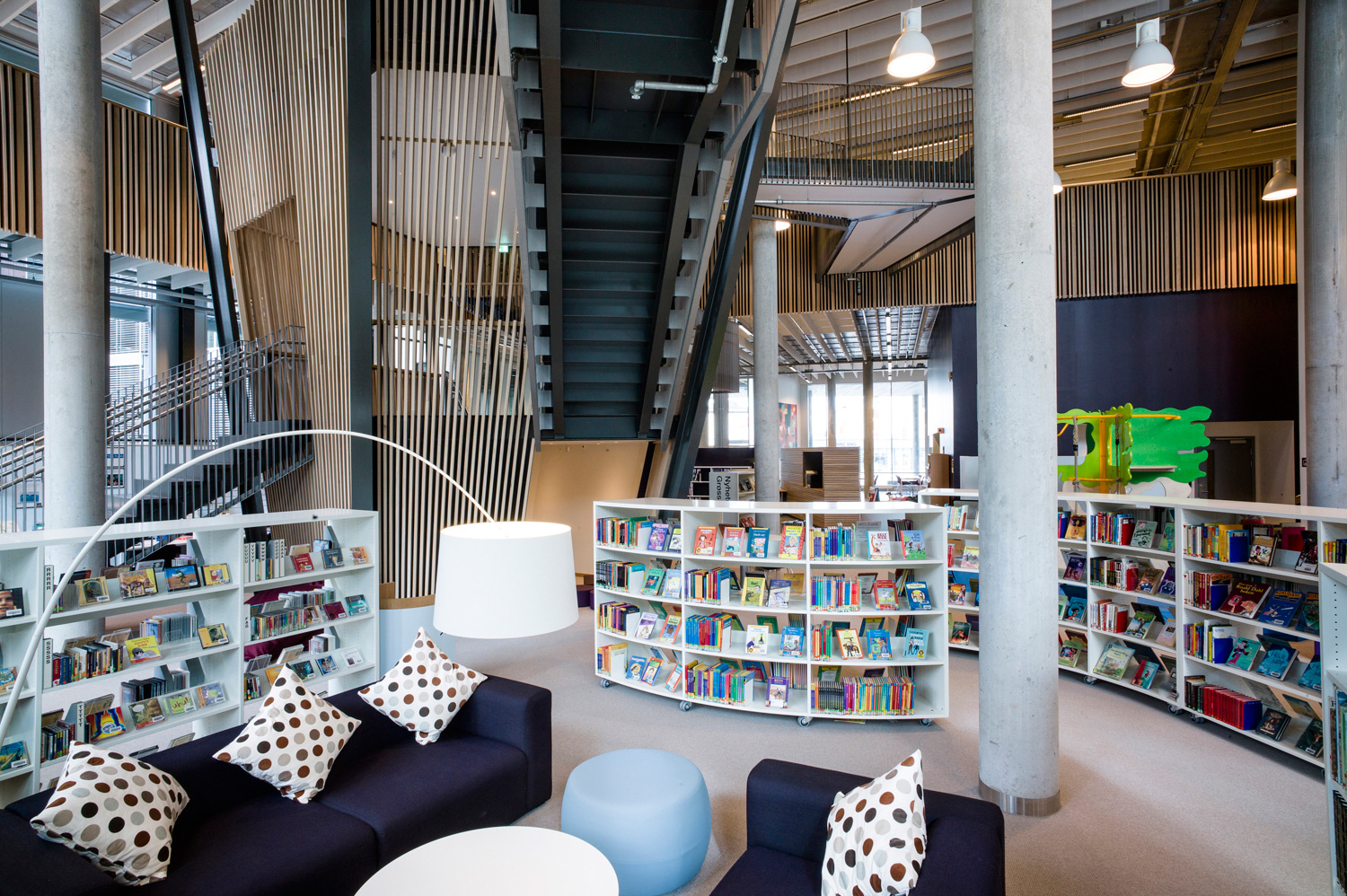 Avec ses formes organiques et ses courbes douces, elle se distingue par une nouvelle approche. Cela se reflète non seulement dans l’architecture, mais aussi dans les rayonnages qui adoptent la forme organique. Les tables et les sièges confortables sont nombreux, ainsi que les points d’information et les bornes de prêt et de retour en libre-service, pour le plus grand plaisir des usagers.
