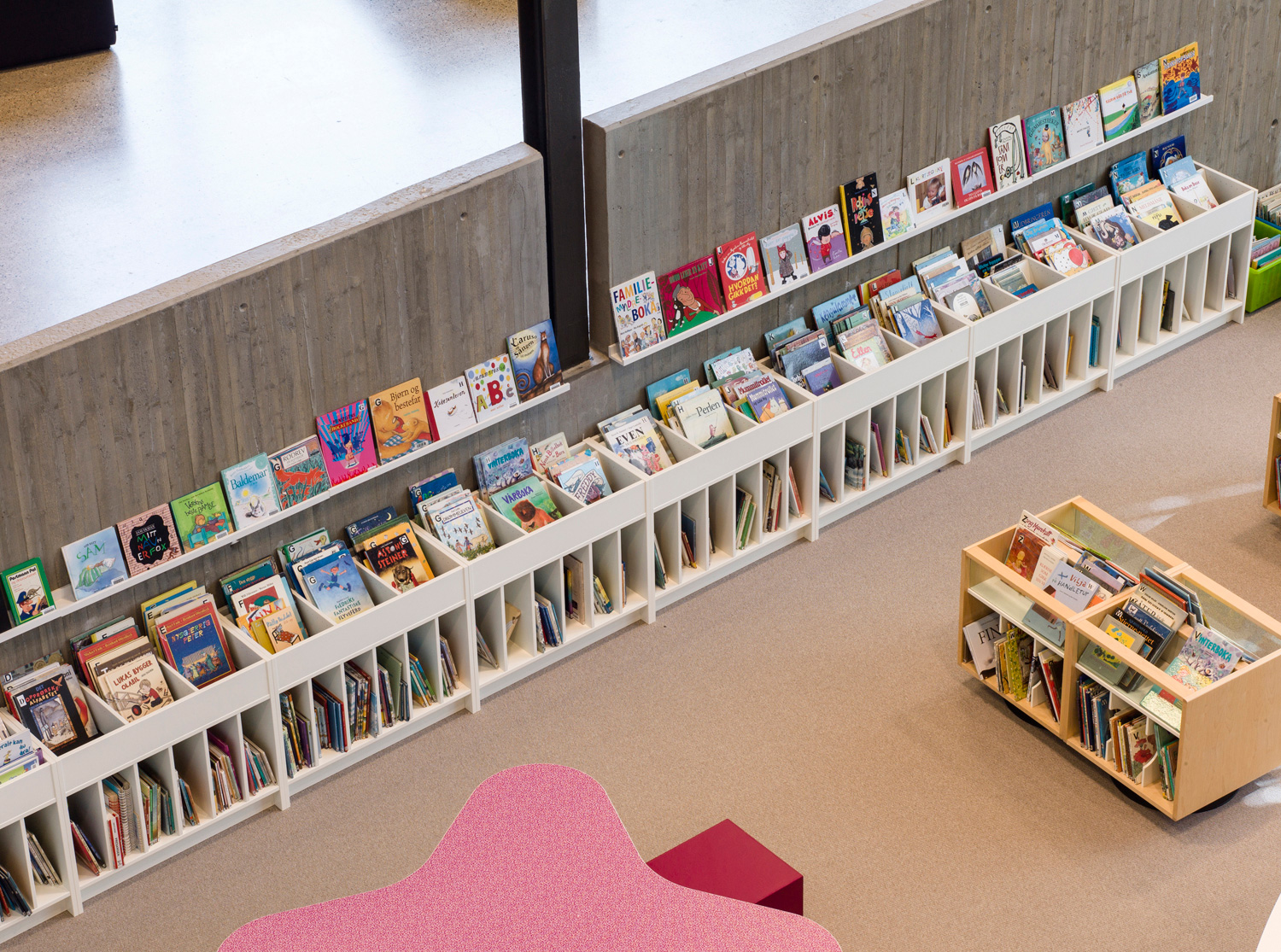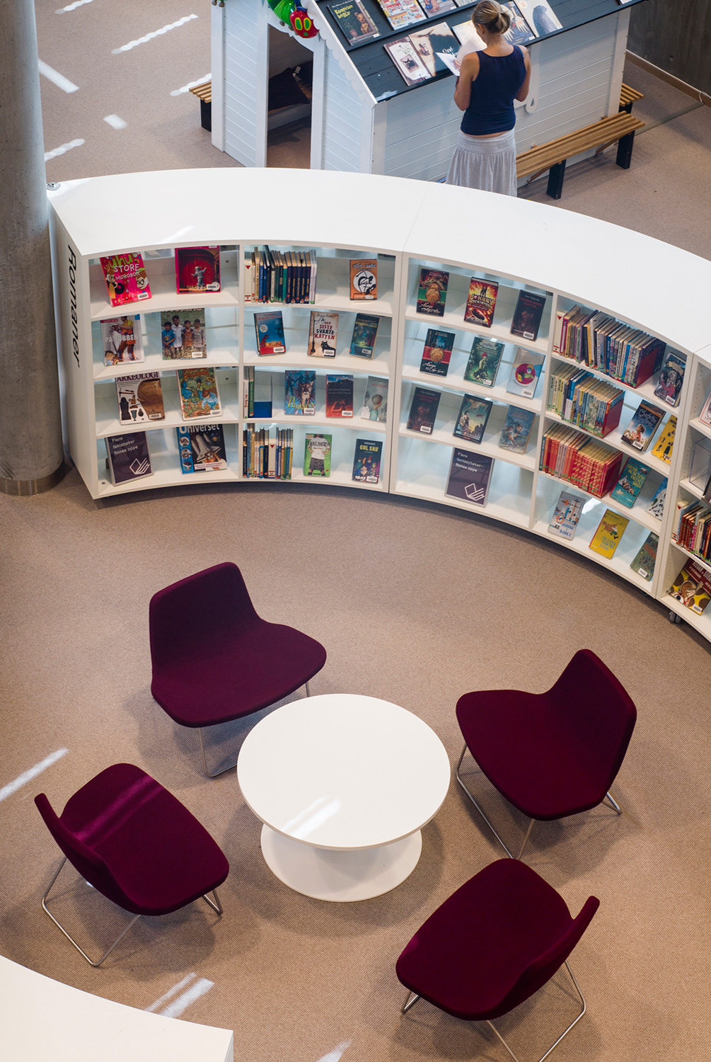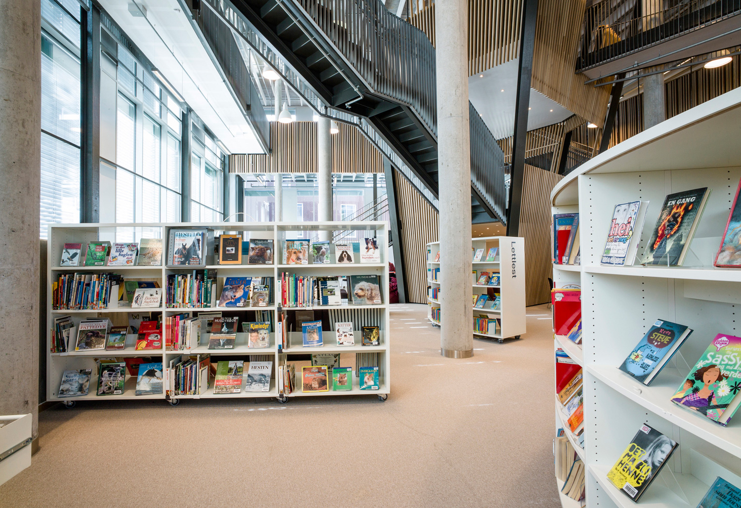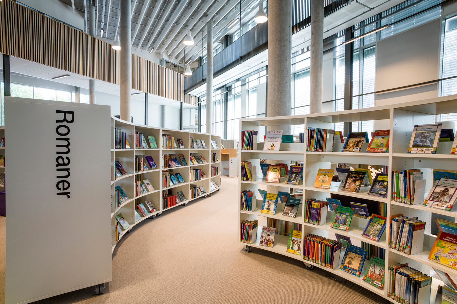 Avec ses formes organiques et ses courbes douces, elle se distingue par une nouvelle approche. Cela se reflète non seulement dans l’architecture, mais aussi dans les rayonnages qui adoptent la forme organique. Les tables et les sièges confortables sont nombreux, ainsi que les points d’information et les bornes de prêt et de retour en libre-service, pour le plus grand plaisir des usagers.