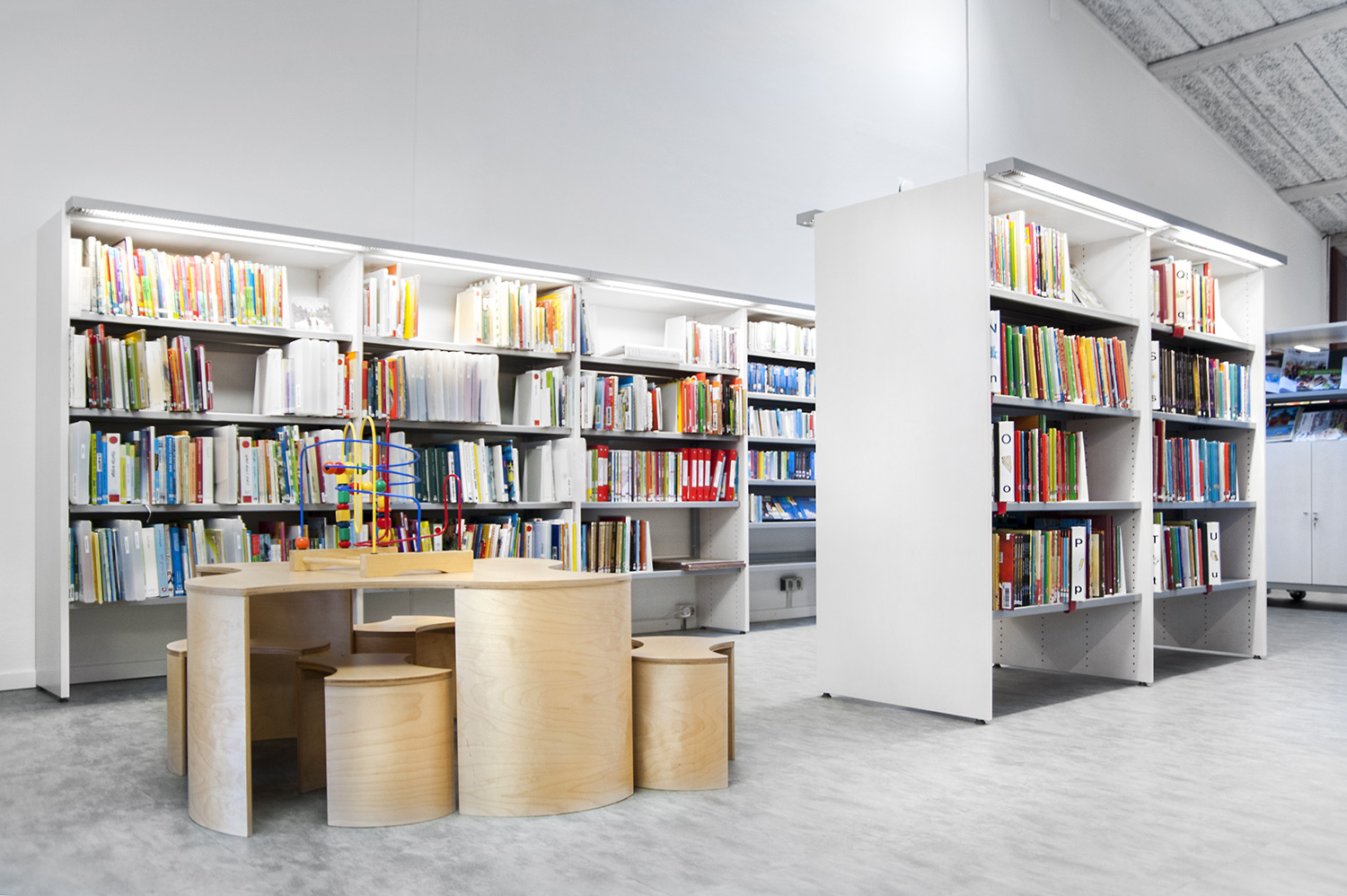 Les formes organiques, présentes sur le mobilier, ainsi que les couleurs intérieures chaleureuses, confèrent à l'espace bibliothèque une atmosphère contemporaine et accueillante.