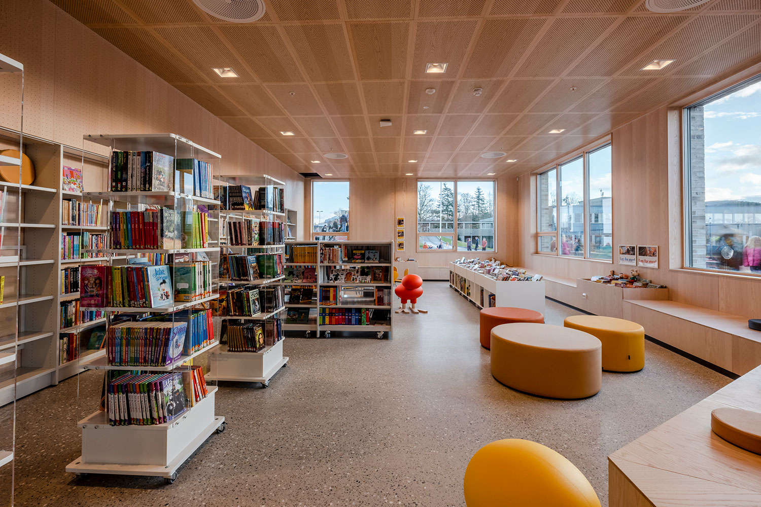 La bibliothèque nouvellement construite à Tau, Superparken, est située au rez-de-chaussée de l'école de Tau.