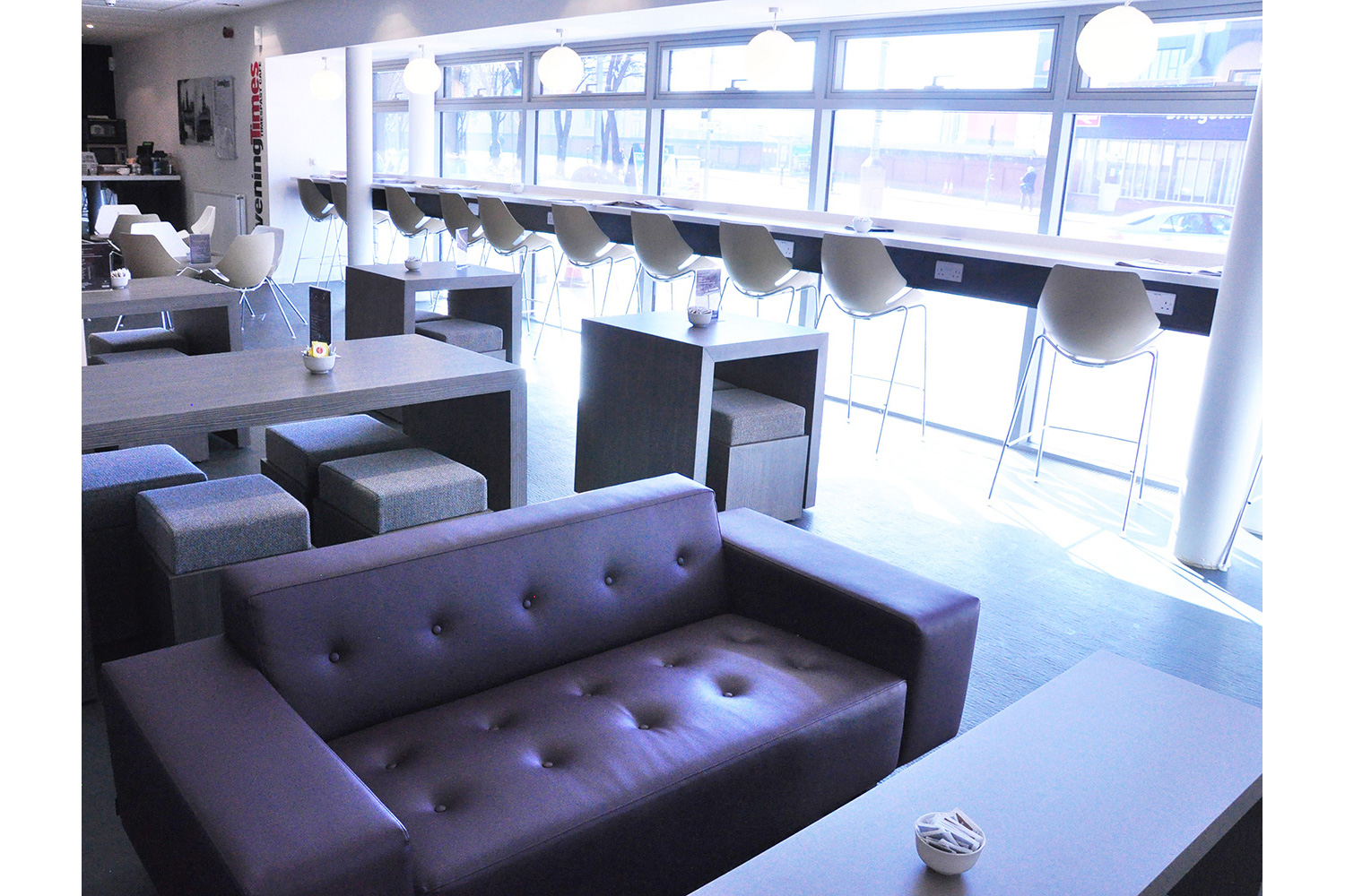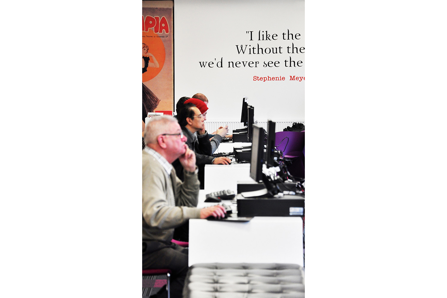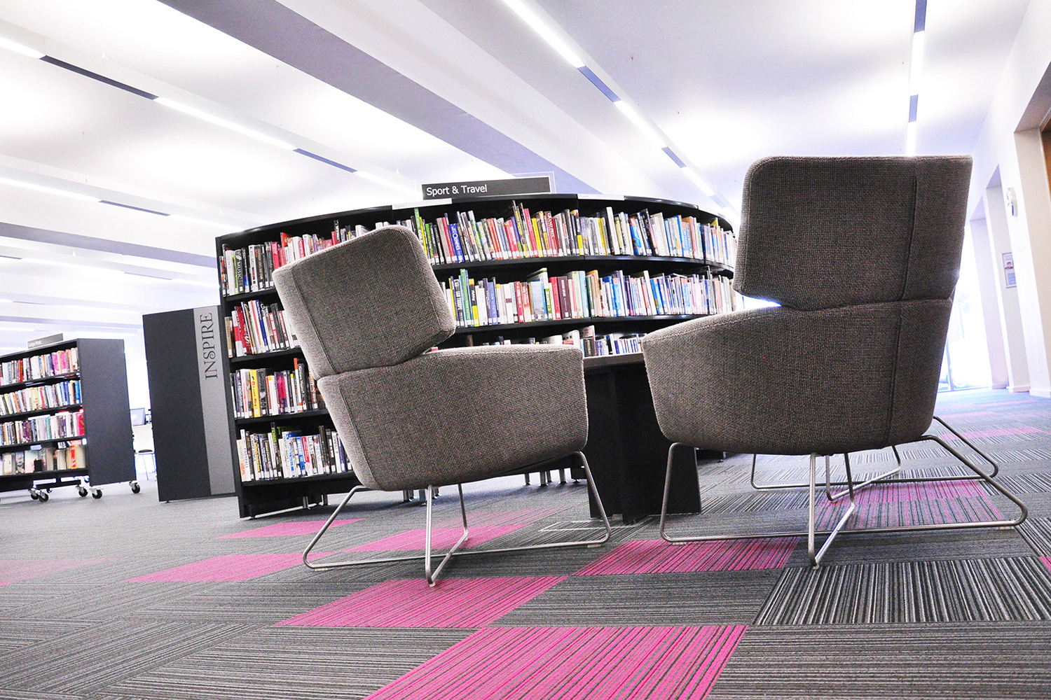 Les principaux thèmes et les sections de la bibliothèque sont renforcés par l’utilisation de graphiques et de signalétique, et avec la permission de Julia Donaldson, détentrice du prix Children’s Laureate (prix décerné tous les deux ans à un écrivain ou illustrateur pour célébrer la qualité de ses publications), nous avons utilisé les images de son livre à succès Gruffalo comme élément graphique mural dans la section enfants et poursuivi ce thème à travers le petit mobilier sur mesure.