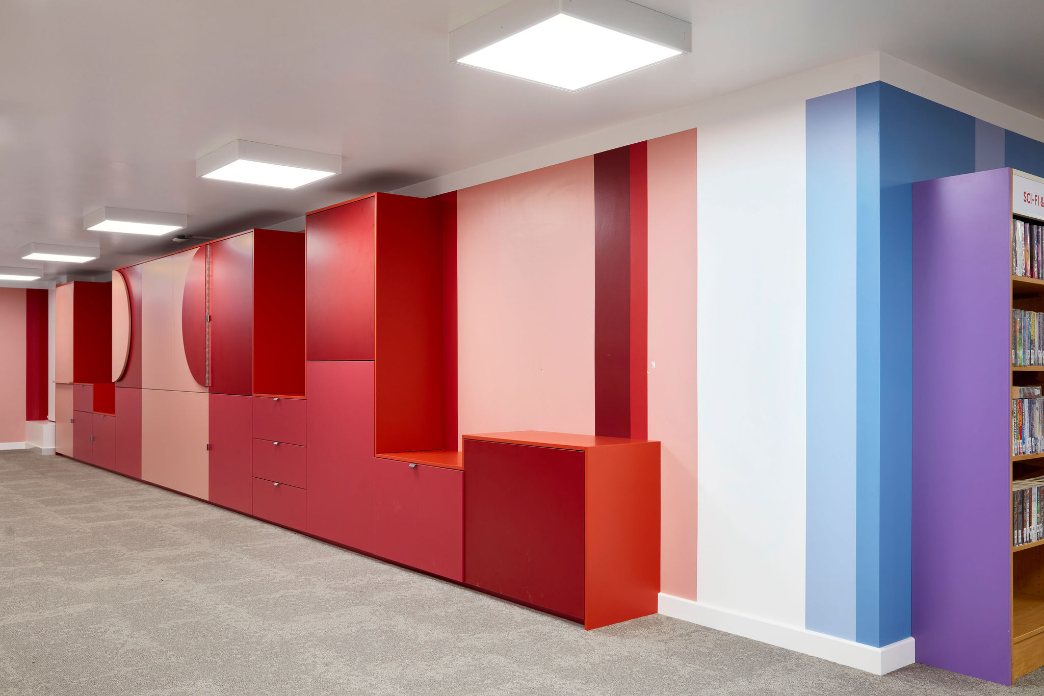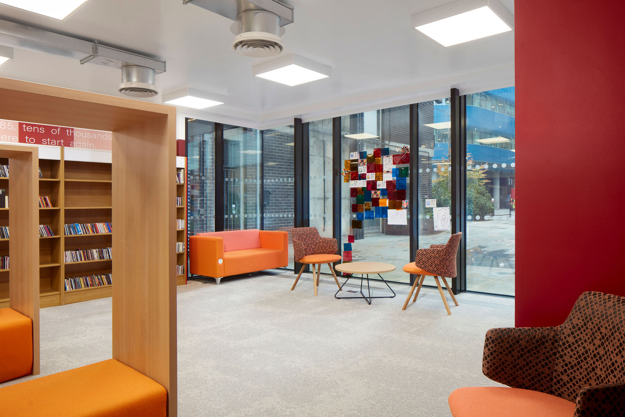 Nous avons réutilisé toutes les étagères murales existantes et les avons remises au goût du jour et équipées d'une signalétique contemporaine. Une partie du mobilier existant a également été réutilisée dans le projet, mais nous avons aussi ajouté de nouveaux meubles de salon collaboratifs avec des prises électriques intégrées pour permettre aux personnes de brancher leurs propres outils numériques en toute sécurité et de les utiliser de manière prolongée. Des tables pour ordinateurs portables sont également disponibles dans toute la bibliothèque, encourageant les utilisateurs de tous âges à trouver leur espace propre pour une utilisation souple.