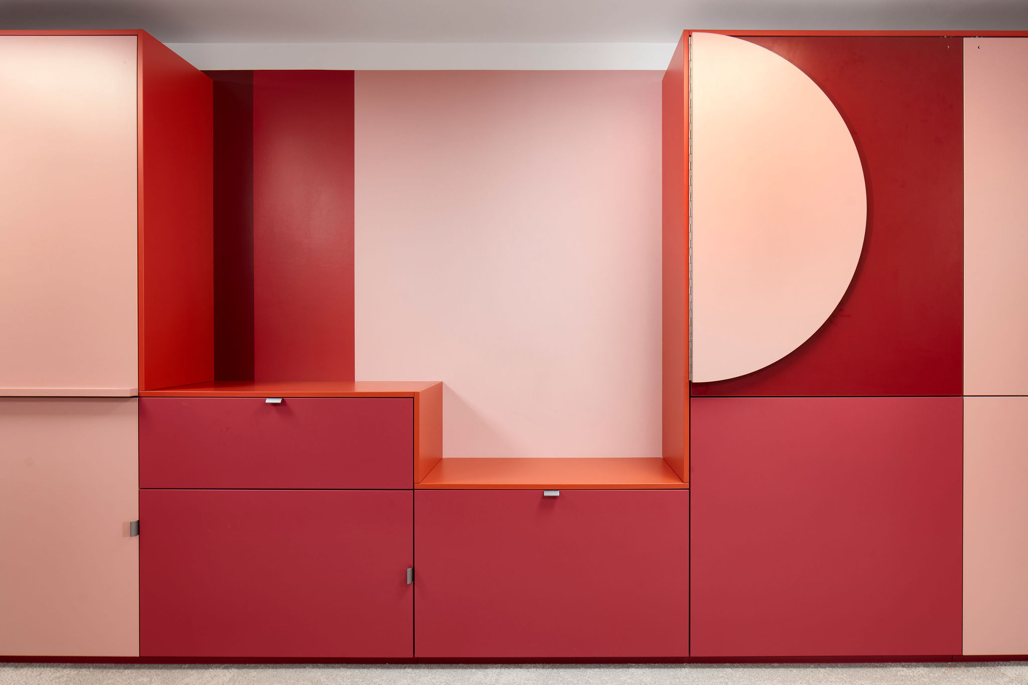 Les rayonnages mobiles de l'îlot bas permettent une flexibilité et un déplacement faciles afin d'ouvrir et d'élargir l'espace pour les activités de groupe, tandis que les assises en forme de "cocon" favorisent un espace sûr, une alcôve, pour se détendre.