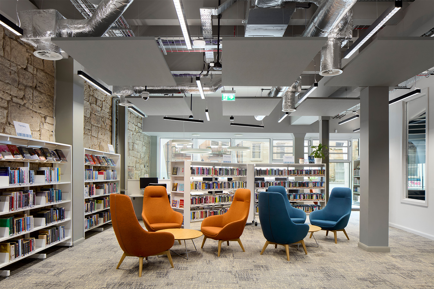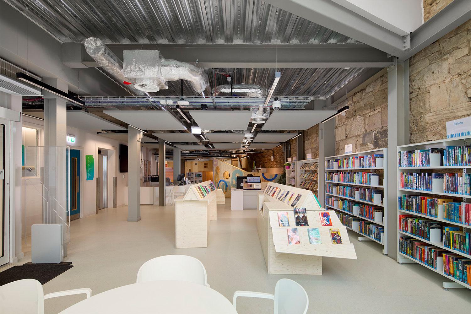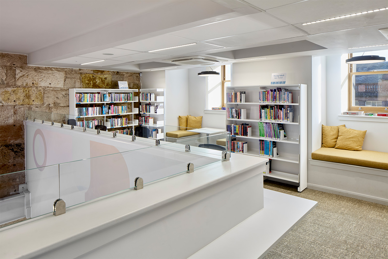 Le projet a consisté à rénover une ancienne galerie marchande sur quatre étages, en y ajoutant une nouvelle façade moderne. Le rez-de-chaussée comprend une zone d'accueil et offre un endroit où tout le monde est invité à venir et à profiter de ce qui est l'une des plus belles bibliothèques d'Écosse.