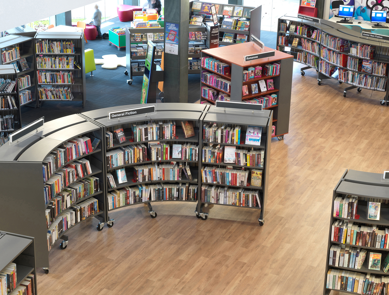 La bibliothèque est dotée de la toute dernière technologie, avec notamment un ensemble d’infrastructures spécialisées pour les aveugles et les personnes malvoyantes. Le bâtiment comporte également une zone dédiée à l’histoire locale et à l’histoire de la famille où l’aménagement de rayonnages Gothia avec des panneaux latéraux de bois perforés crée un environnement approprié et traditionnel tout en respectant le sentiment de modernité que dégage l’ensemble du bâtiment.