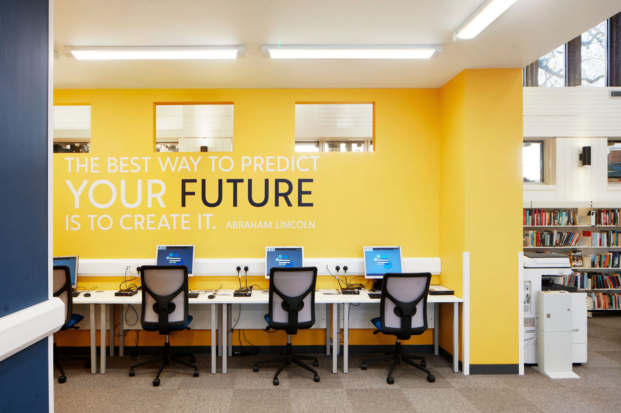 Une attention particulière a été portée à la sélection des tissus et des couleurs pour l'ensemble du mobilier. Thedesignconcept ltd. a sélectionné toutes les couleurs de la bibliothèque et les a agrémentées de graphiques numériques soigneusement sélectionnés et de citations inspirantes qui embellissent l'ambiance générale de l'espace, permettant ainsi aux visiteurs d'être plus positifs et plus enthousiastes. Nous avons imaginé une mise en place de la moquette qui fait appel à un placement aléatoire de couleurs qui s'adaptera à tout autre aménagement futur de l'espace.