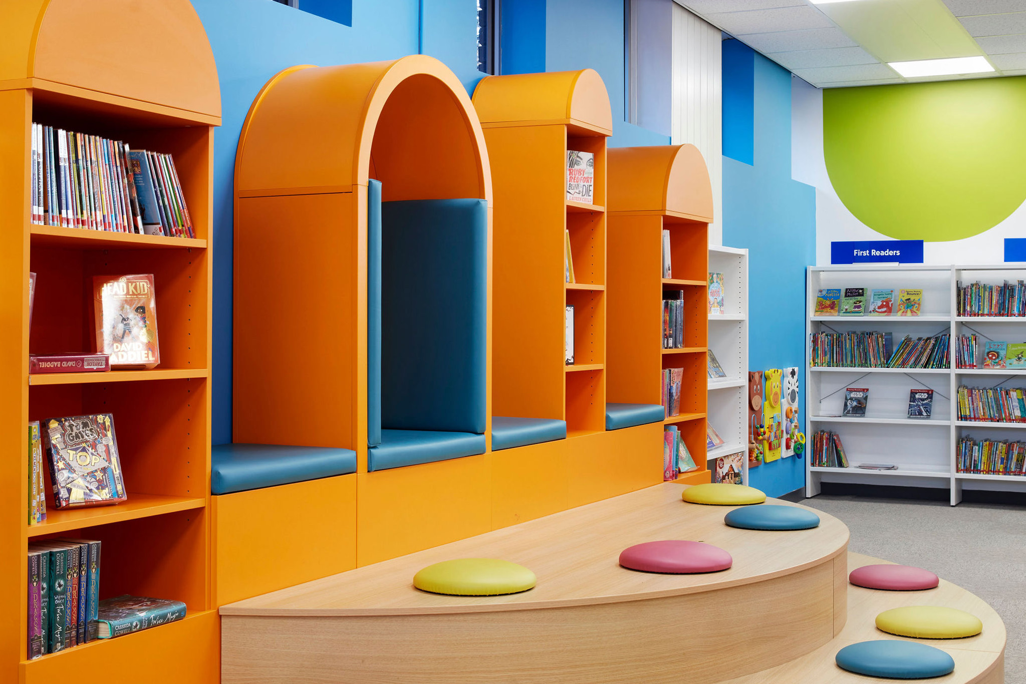 L'espace jeunesse est joyeux et attrayant, avec des couleurs vives et des formes amusantes conçues pour inciter les enfants à entrer dans la bibliothèque et les encourager à explorer la grande diversité de livres. L'espace scénique, fabriqué sur mesure, est exceptionnellement plurifonctionnel et permet des activités de lecture individuelles ou en groupe. L'intégration d'éléments sensoriels dans la conception de l'espace pour enfants était vraiment importante pour s'assurer que le lieu soit inclusif et accueillant pour toutes les familles.