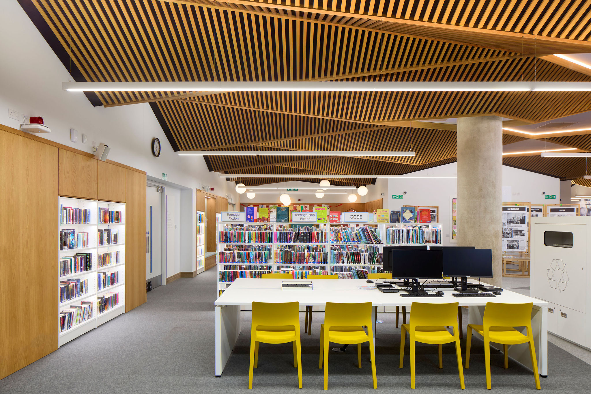 La nouvelle bibliothèque est située au rez-de-chaussée d'un immeuble résidentiel avec des logements dans les étages supérieurs. L'accès aux espaces se fait par l'entrée principale de la bibliothèque pendant les heures d'ouverture et par une porte secondaire séparée en dehors de celles-ci.