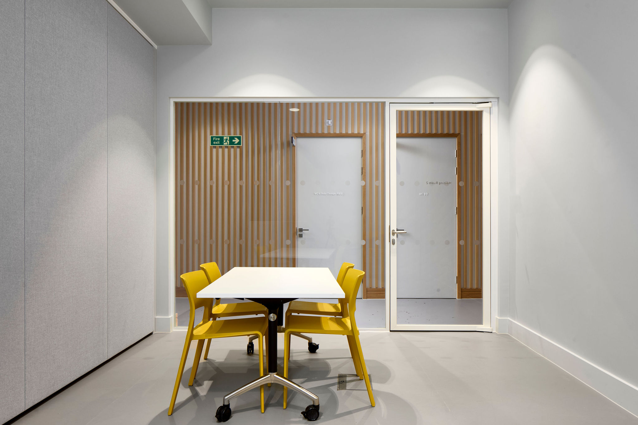 La salle polyvalente est dotée d'un revêtement de sol en bois durable et résistant à l'eau. L'ensemble des salles communes sont équipées de projecteurs et s'ouvrent directement sur la bibliothèque pour enfants au moyen de portes coulissantes.