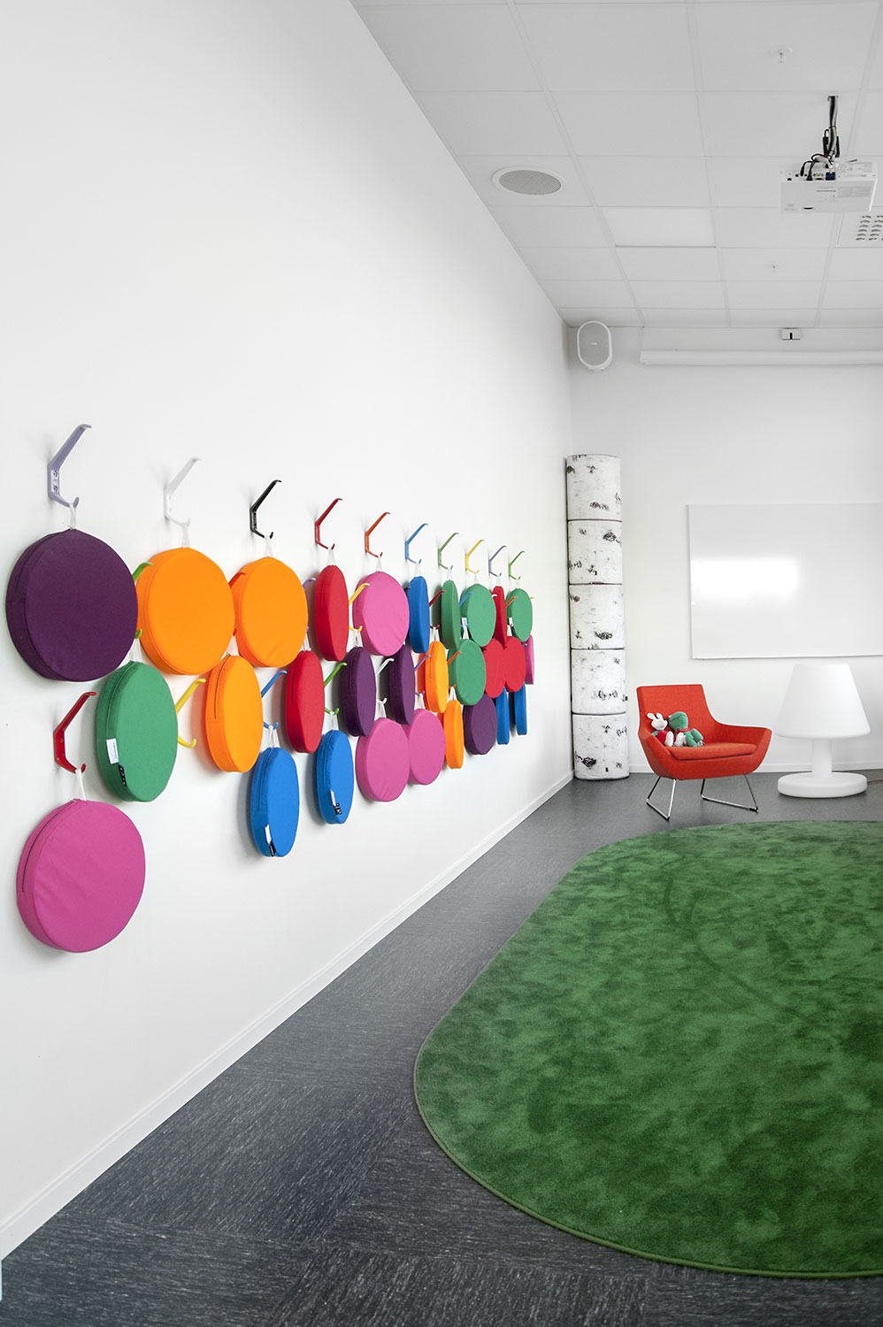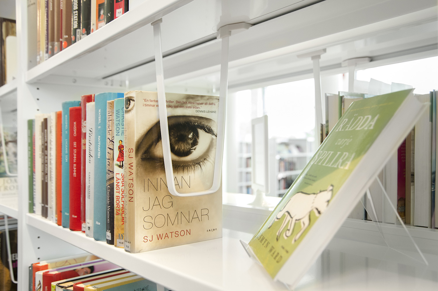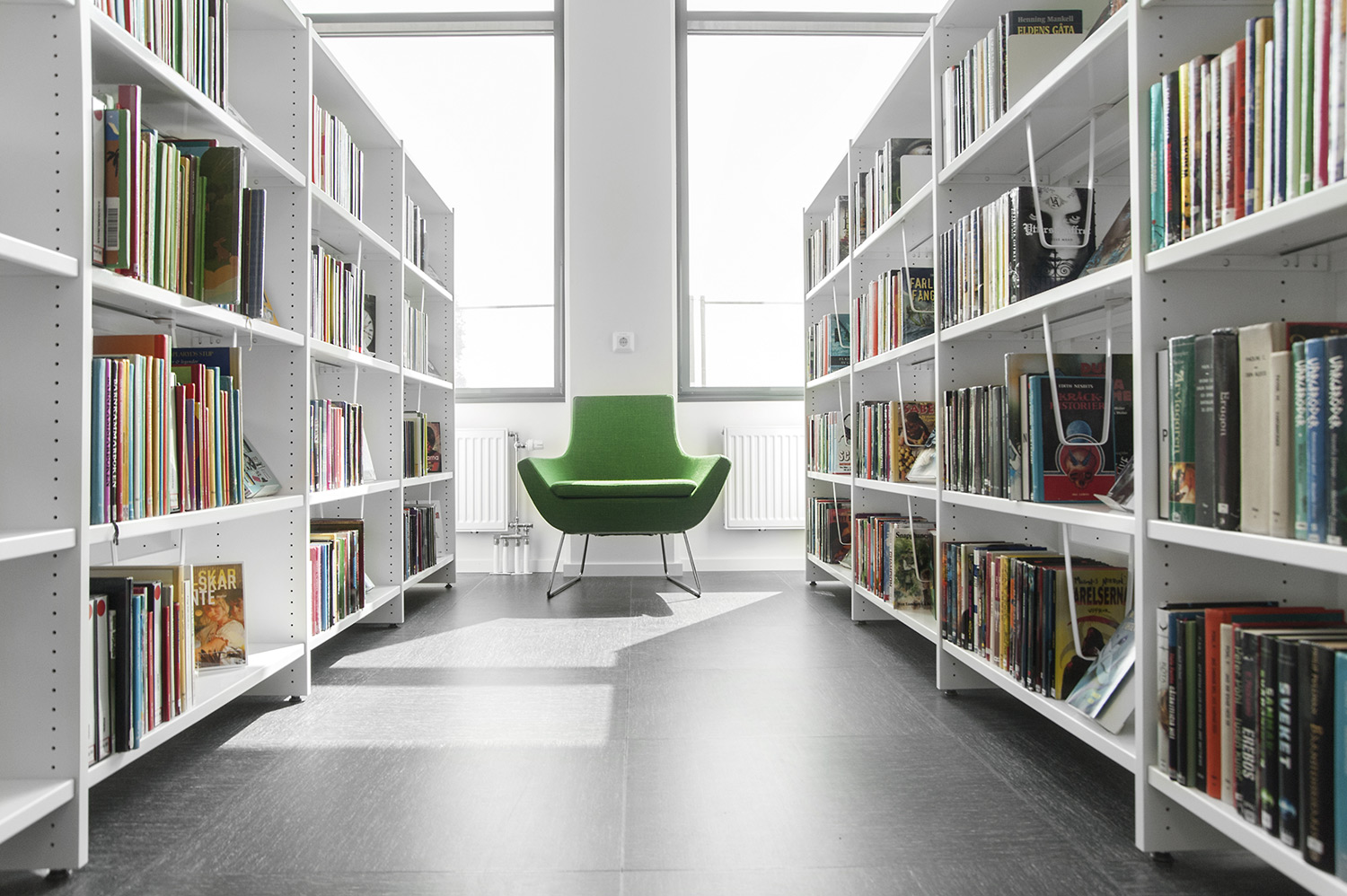 La bibliothèque est équipée d’un système de rayonnage Frontline de couleur blanche doté de diverses fonctionnalités, comme des espaces de rangement pour les périodiques ou encore des tablettes de présentation. Le système de rayonnage est aménagé de manière à être accessible depuis n’importe quel endroit de la bibliothèque.