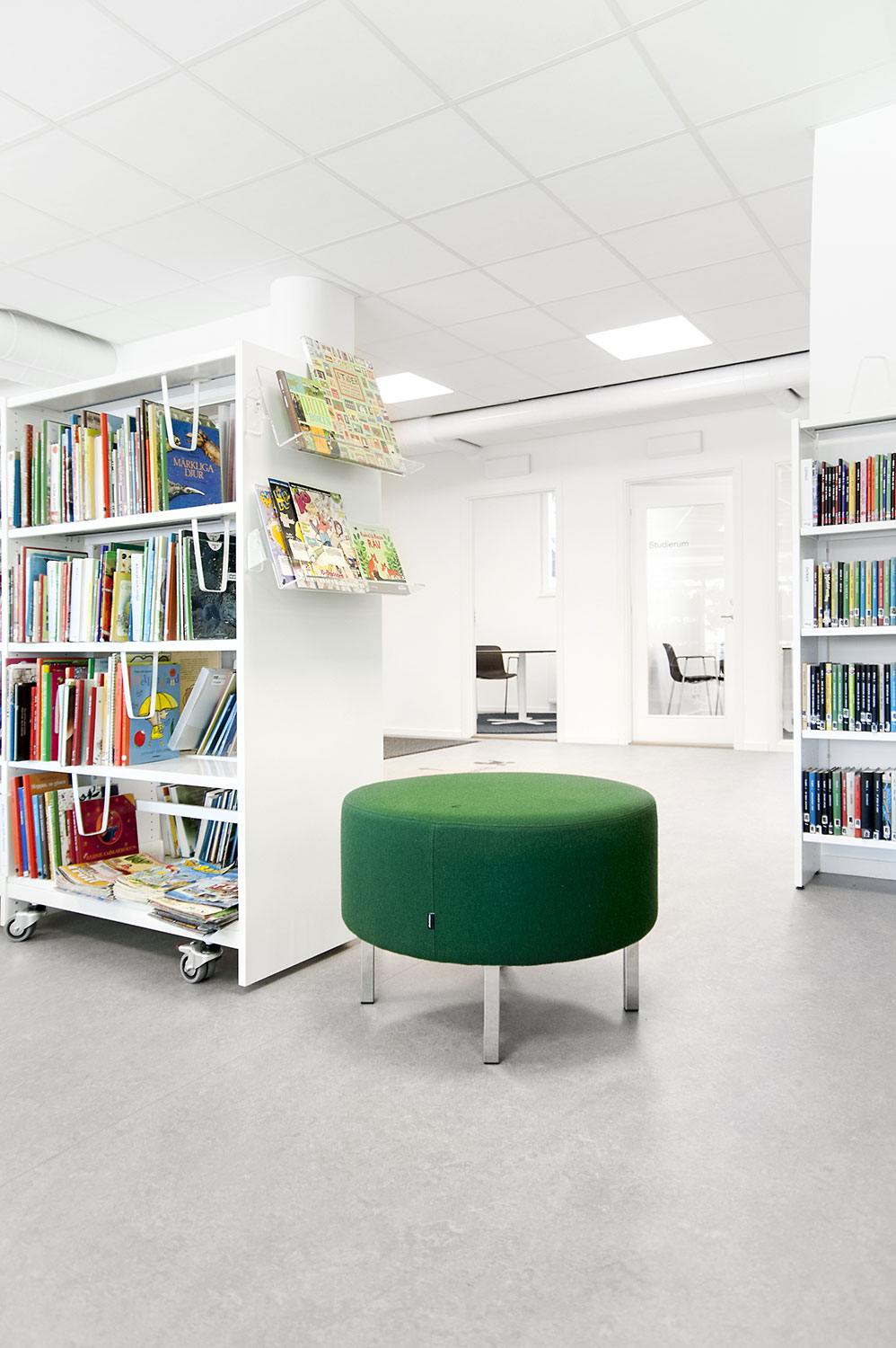 Cette nouvelle bibliothèque, plus spacieuse, s’étend sur 400 m2 et propose de nombreuses activités. La zone enfants a été agrandie et les jeunes lecteurs disposent désormais de leur propre coin « cosy ». Outre la lecture et le prêt de livres, les visiteurs peuvent notamment louer des salles de réunion, étudier, utiliser des ordinateurs ou encore suivre des cours de langue. L’accent a été mis sur une signalétique claire et l’utilisation de teintes apaisantes sur les murs et au sol pour créer une belle harmonie avec le blanc, qui reste la couleur prédominante.