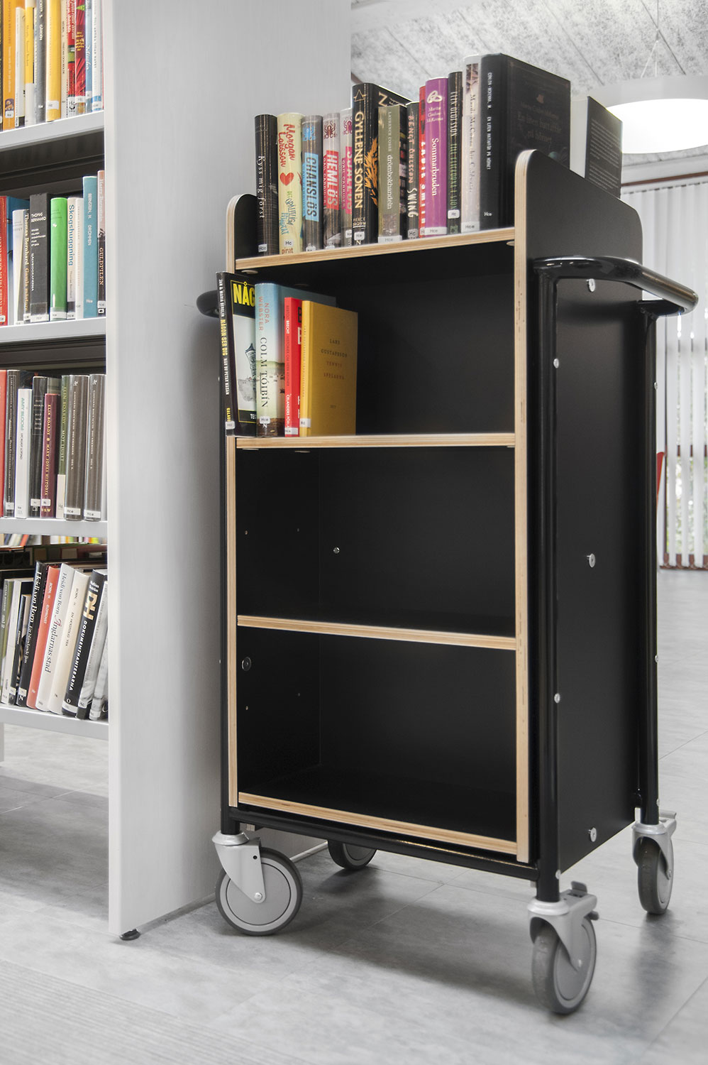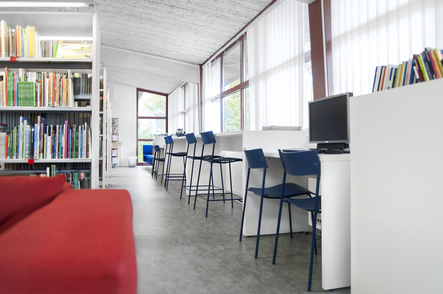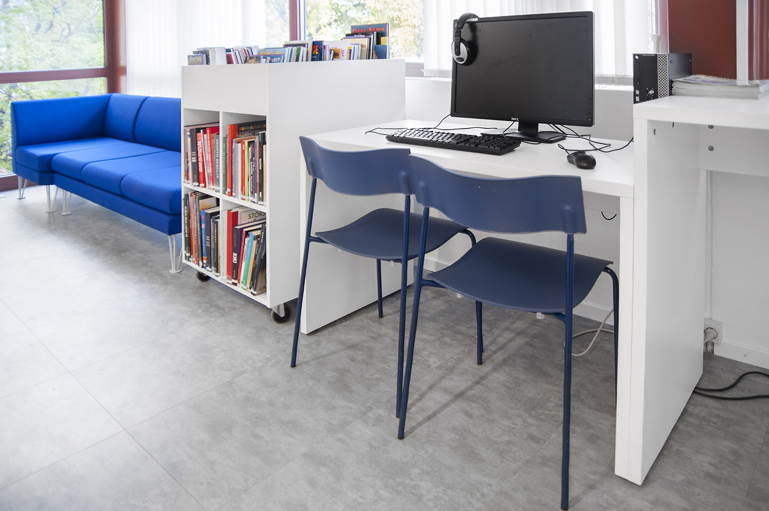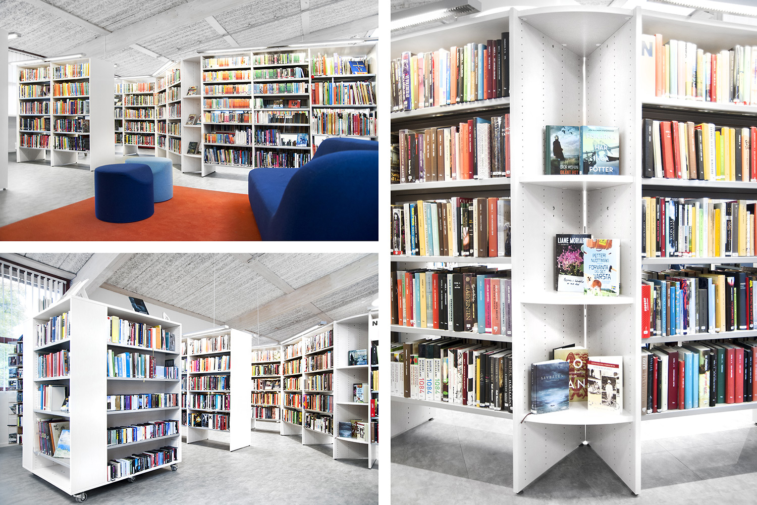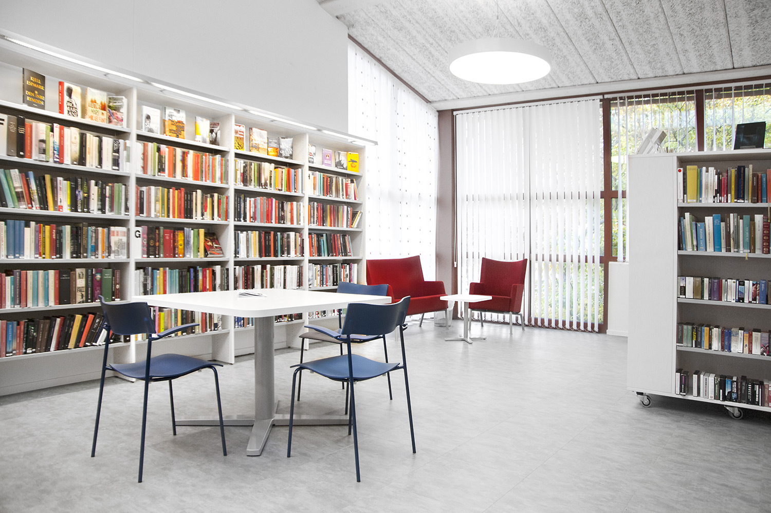 Lammhults Biblioteksdesign a fourni les rayonnages Slimline surmontés d’un éclairage Big Book. Ces rayonnages et tablettes de couverture en plaqué bouleau de couleur blanche contrastent joliment avec les tablettes en métal gris argenté. Le même système de rayonnage a été utilisé pour la section des périodiques, mais avec d’autres équipements. Ces modules Slimline sont en effet montés sur roulettes, avec des tablettes de présentation dans la partie supérieure et des portes dans la partie inférieure pour offrir des espaces de rangement fermés.