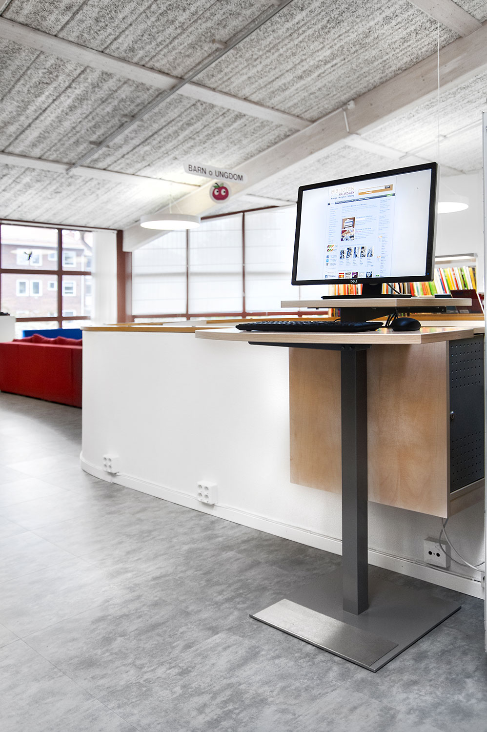 Les banques d’accueil à hauteur réglable électrique Concertina créent des points d’information visibles dans la bibliothèque et offrent un environnement de travail ergonomique pour le personnel.