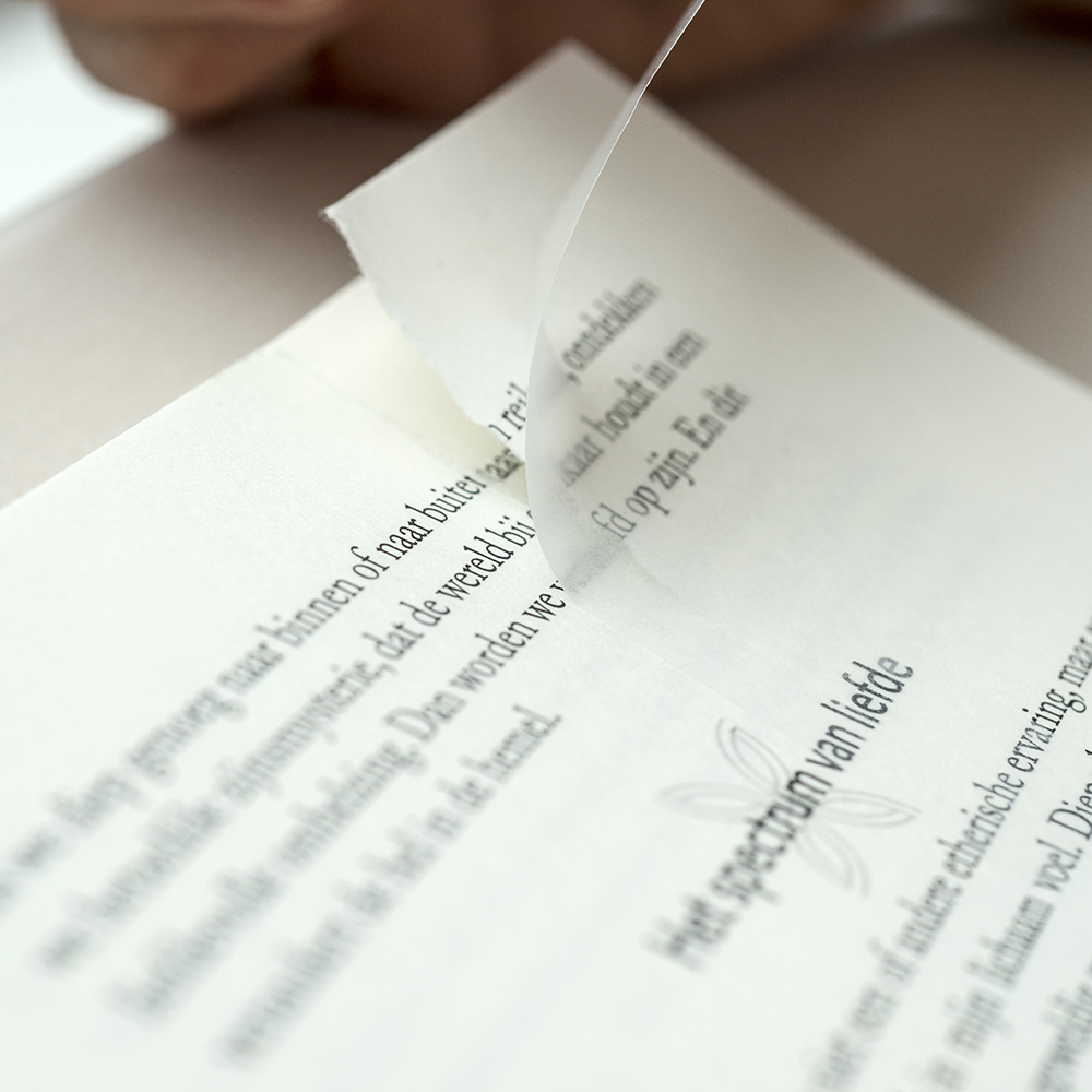 Papier spécial stable, robuste, doux et ultra-transparent. Revêtement résistant au vieillissement et au jaunissement, adhésif acrylique élastique, tamponné avec du CACO3, légèrement alcalin afin d’empêcher toute détérioration des documents, mais avec un pouvoir tampon suffisant pour prévenir la destruction par l’acidité.