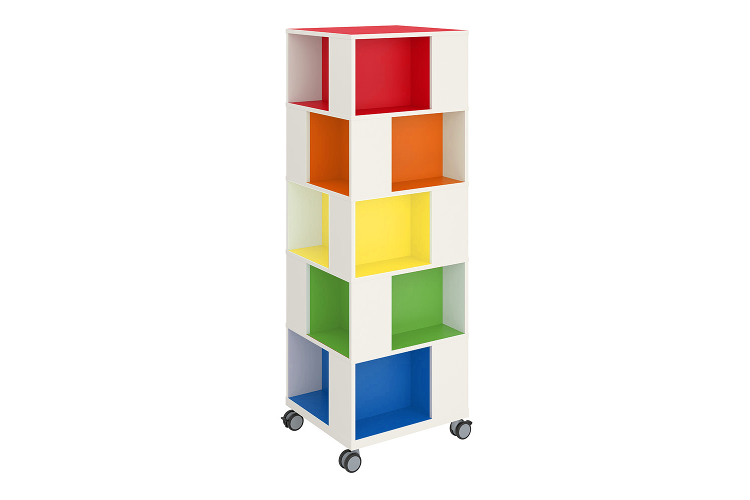 La tour à livres Labyrinth est disponible en trois hauteurs différentes (trois, quatre ou cinq niveaux) et permet le rangement d’environ 180 à 300 livres de poche. Elle possède quatre roulettes, dont deux avec frein.