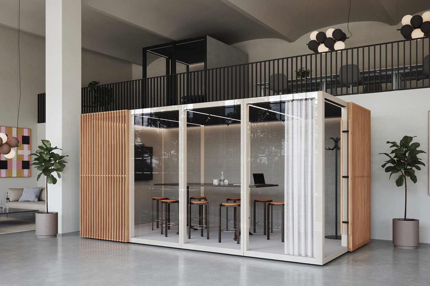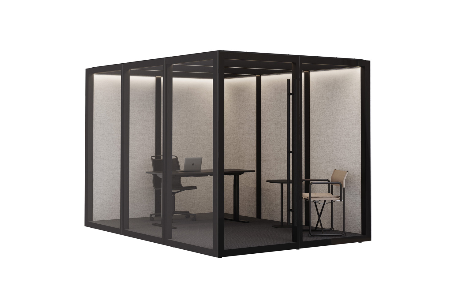 Zen Pod® combine une technologie avancée d’isolation acoustique avec un design élégant. Deux parois sont composées de verre acoustique, tandis que les autres murs, recouverts de textiles à l’intérieur comme à l’extérieur, garantissent une excellente absorption sonore. Le plafond, quant à lui, offre une isolation phonique supplémentaire et intègre un éclairage doux et agréable.